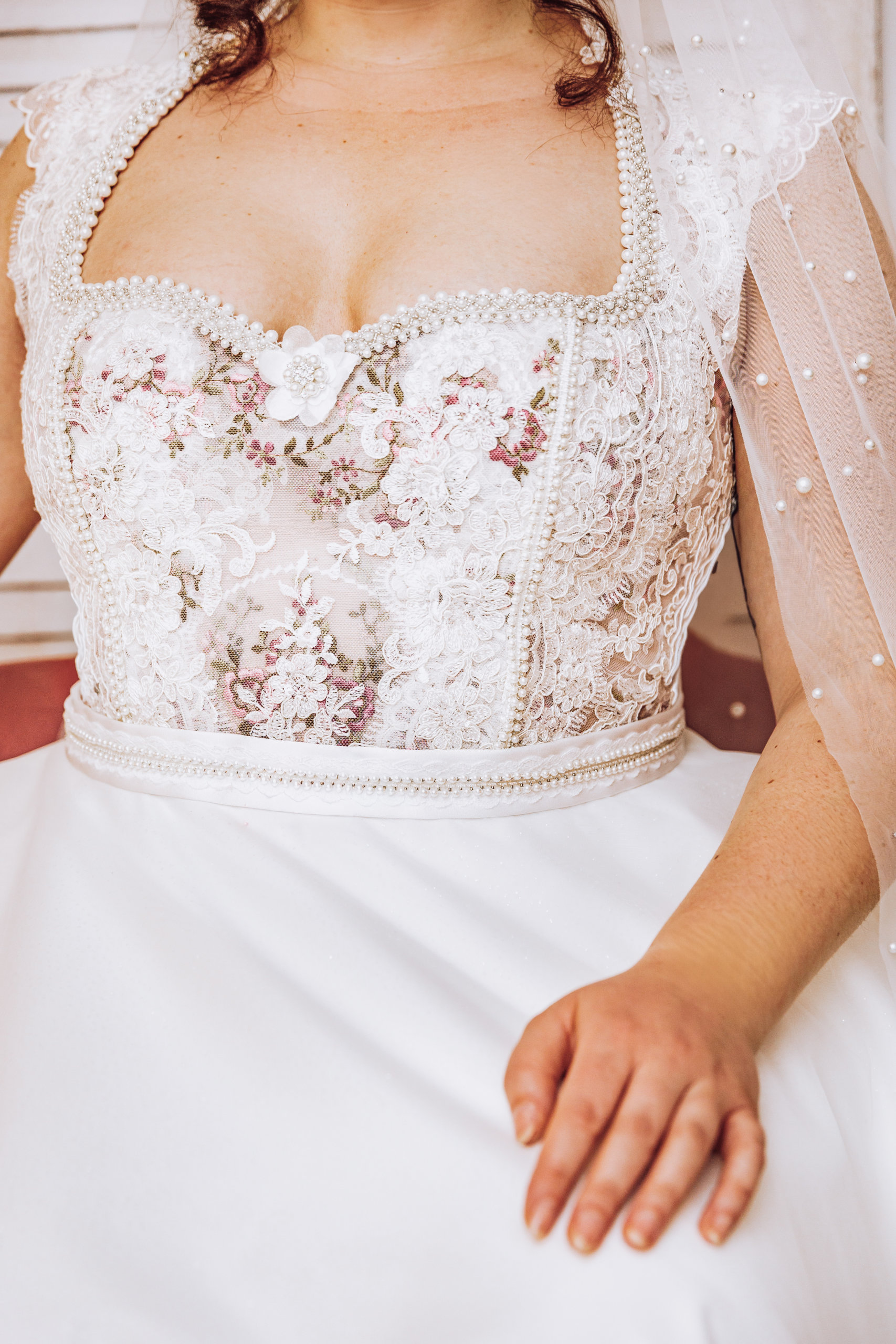 Bei diesem Traumkleid vereinen sich florale Muster, feinste Spitzen & Haute Couture in Vollendung. Handbestickt der Dirndlausschnitt mit feinsten Blüten, Perlen & Borten – auch Transparenz & 3D-Look verzaubern & begeistern die Braut. Auch der Rücken lässt mit seiner besondereren, romantischen  Transparenz keine Brautwünsche offen.