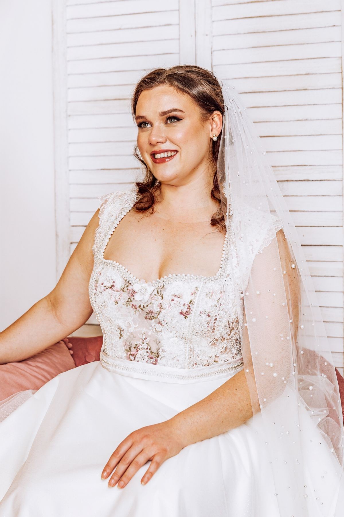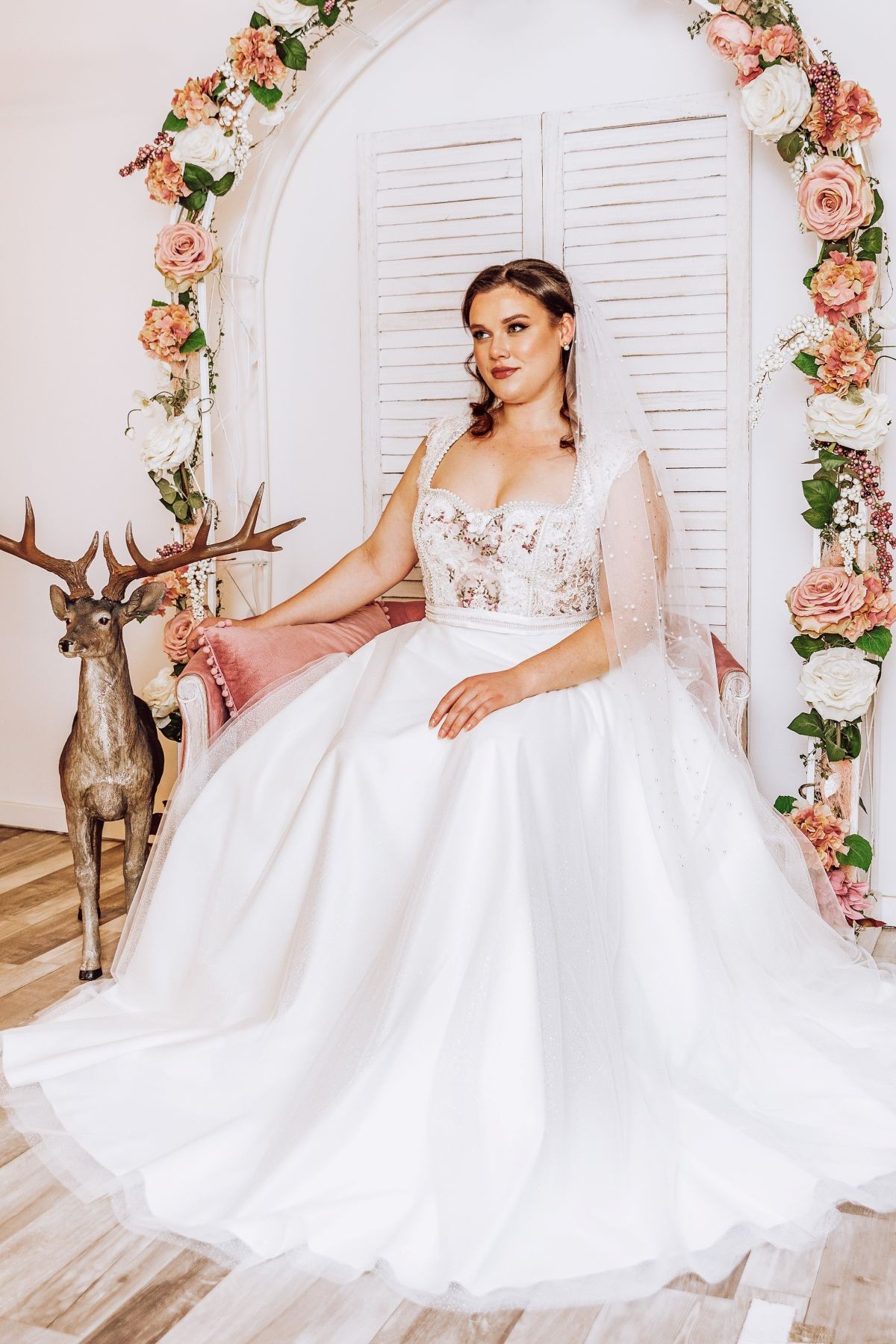 Wie jedes unserer Kleider ist dieses Modell auch mit anderen Rockformen, variablen Details & mit unserem Highlight dem Brautüberrock erhältlich.