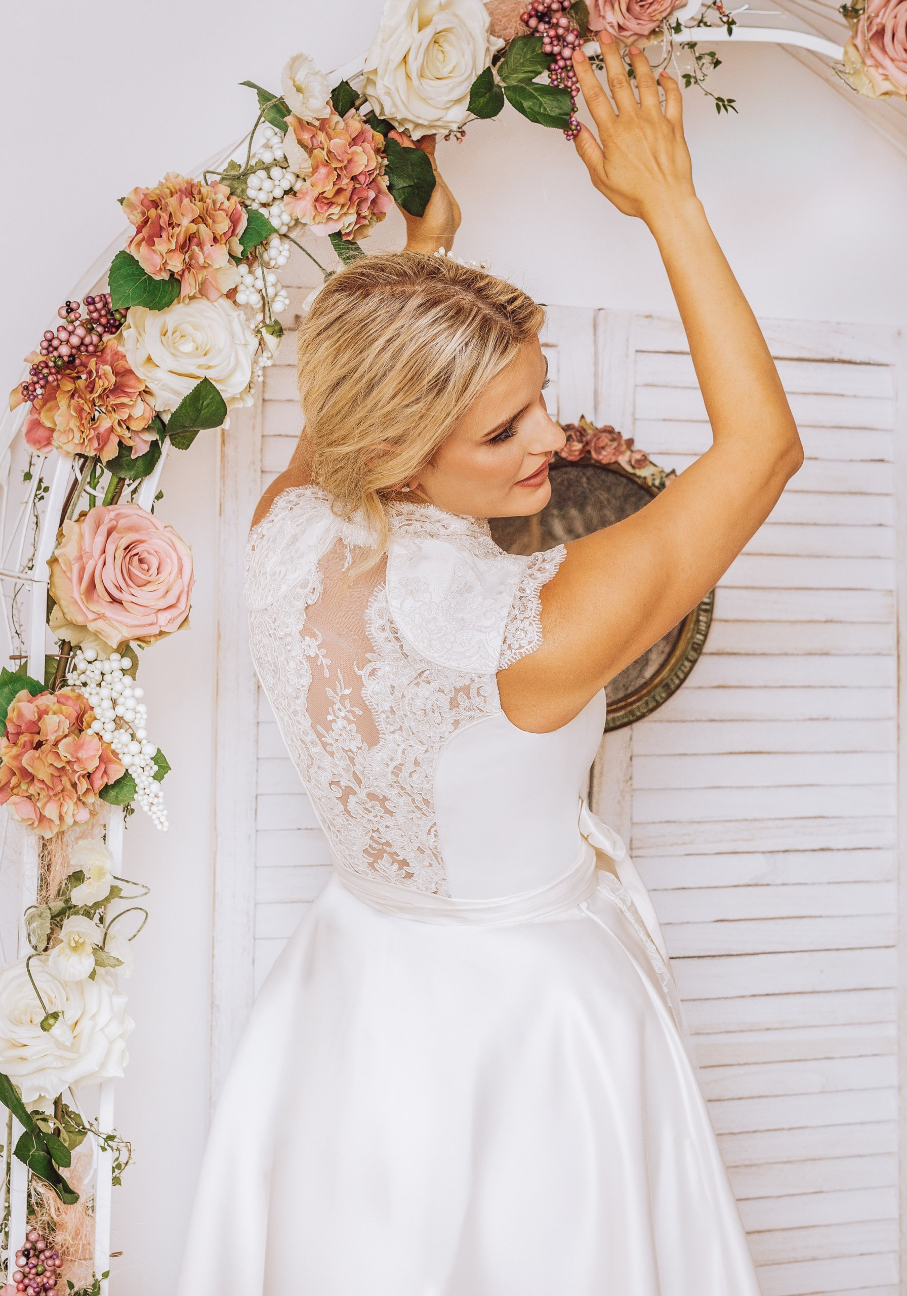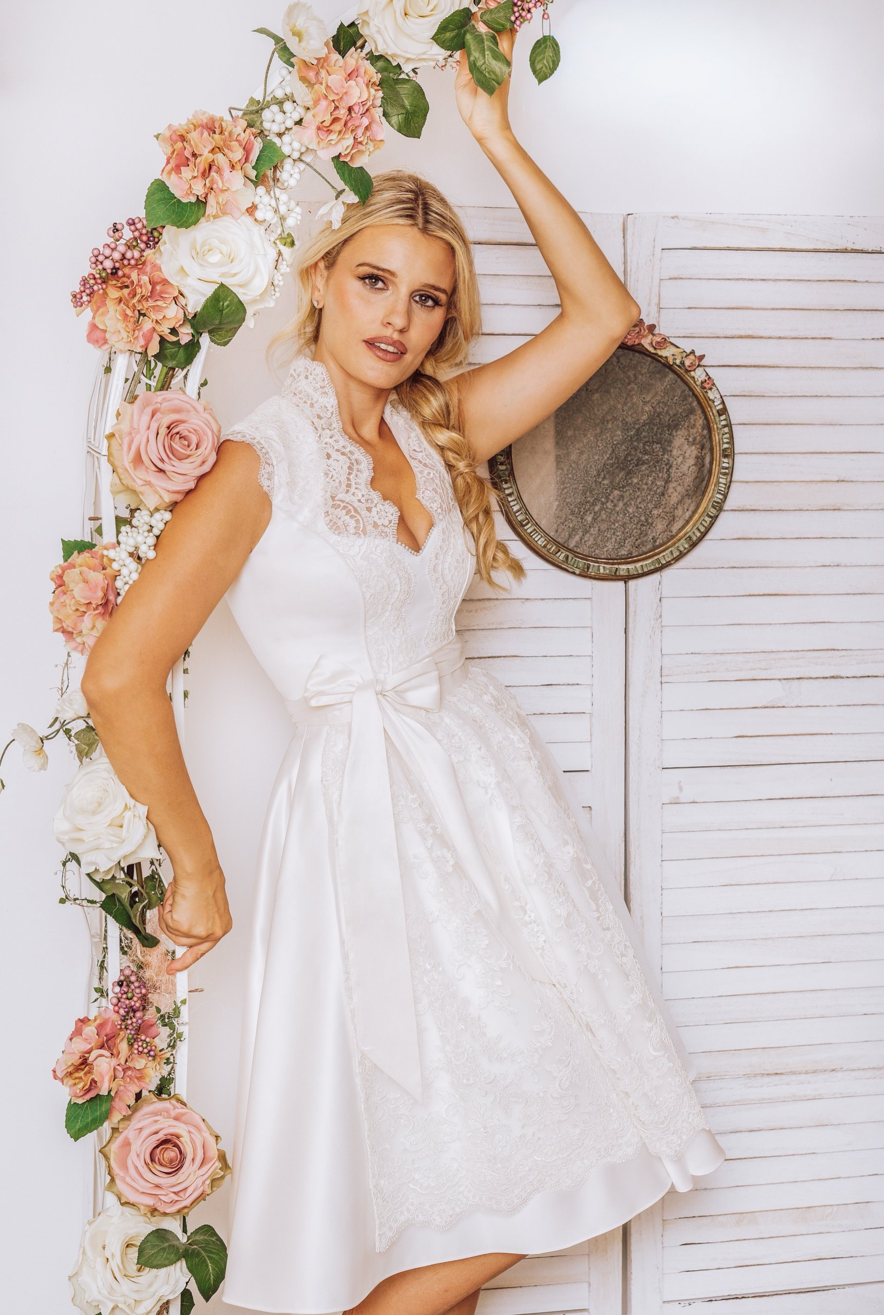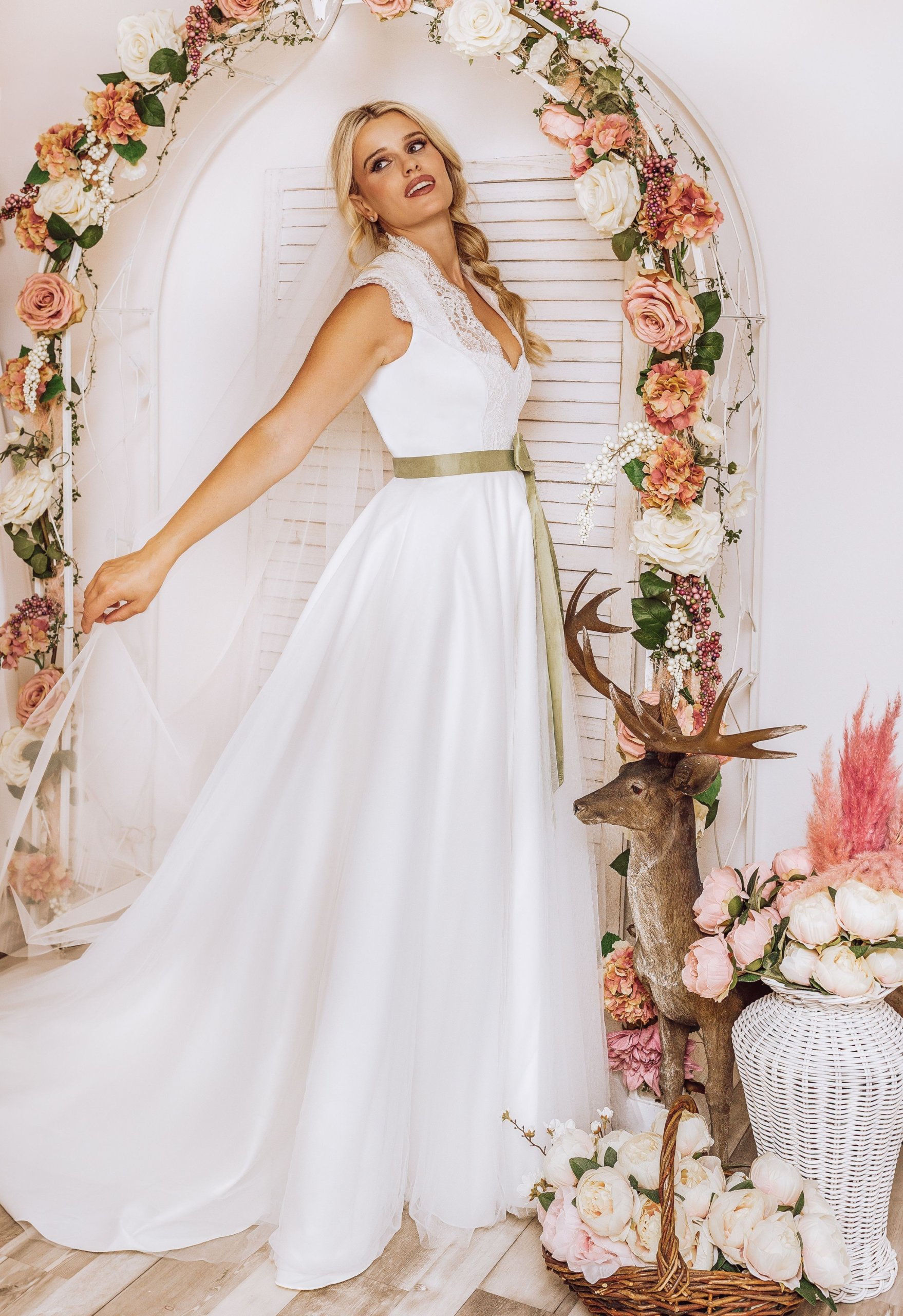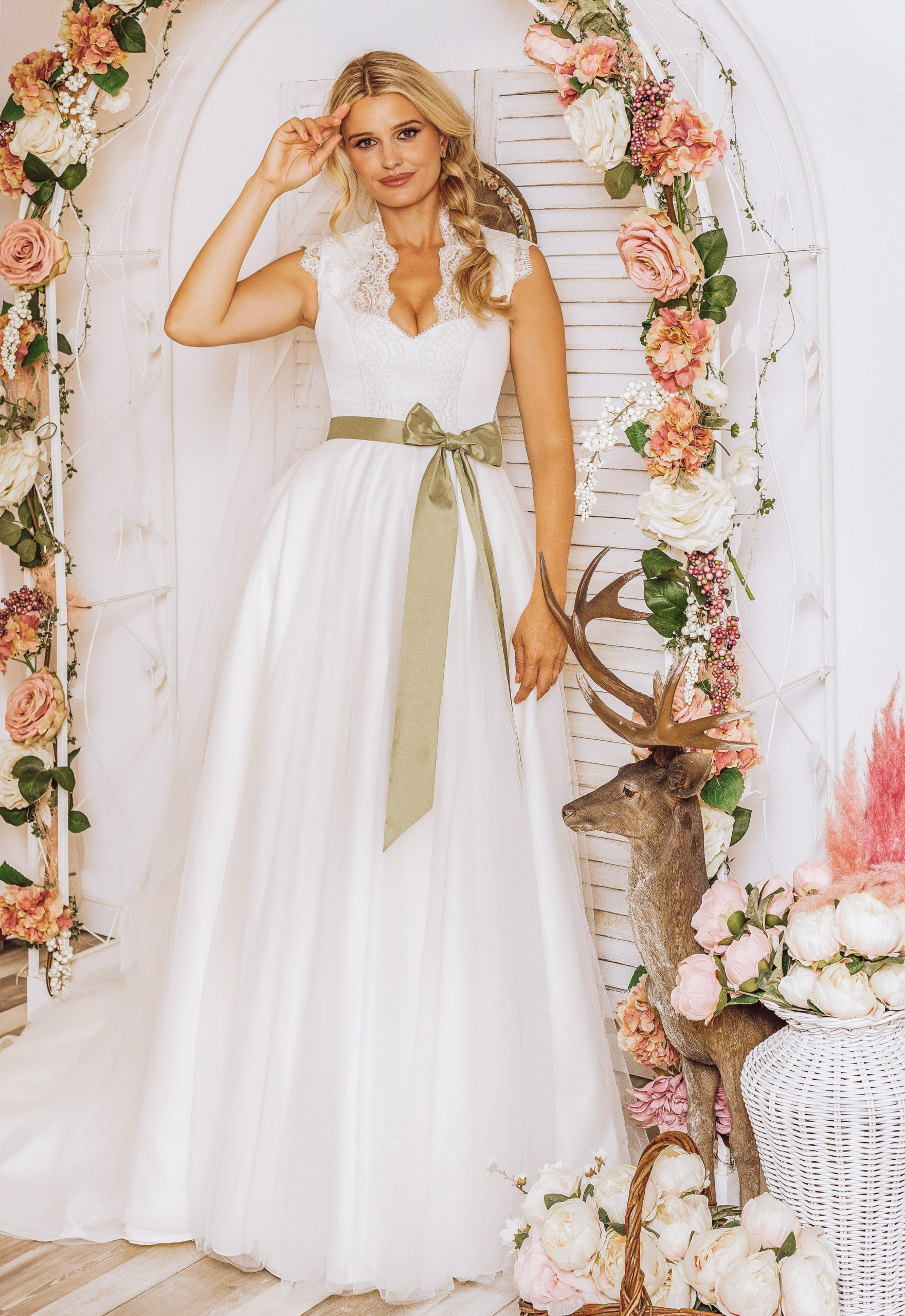 Wie jedes unserer Kleider ist dieses Modell auch mit anderen Rockformen, variablen Details & mit unserem Highlight dem Brautüberrock erhältlich.