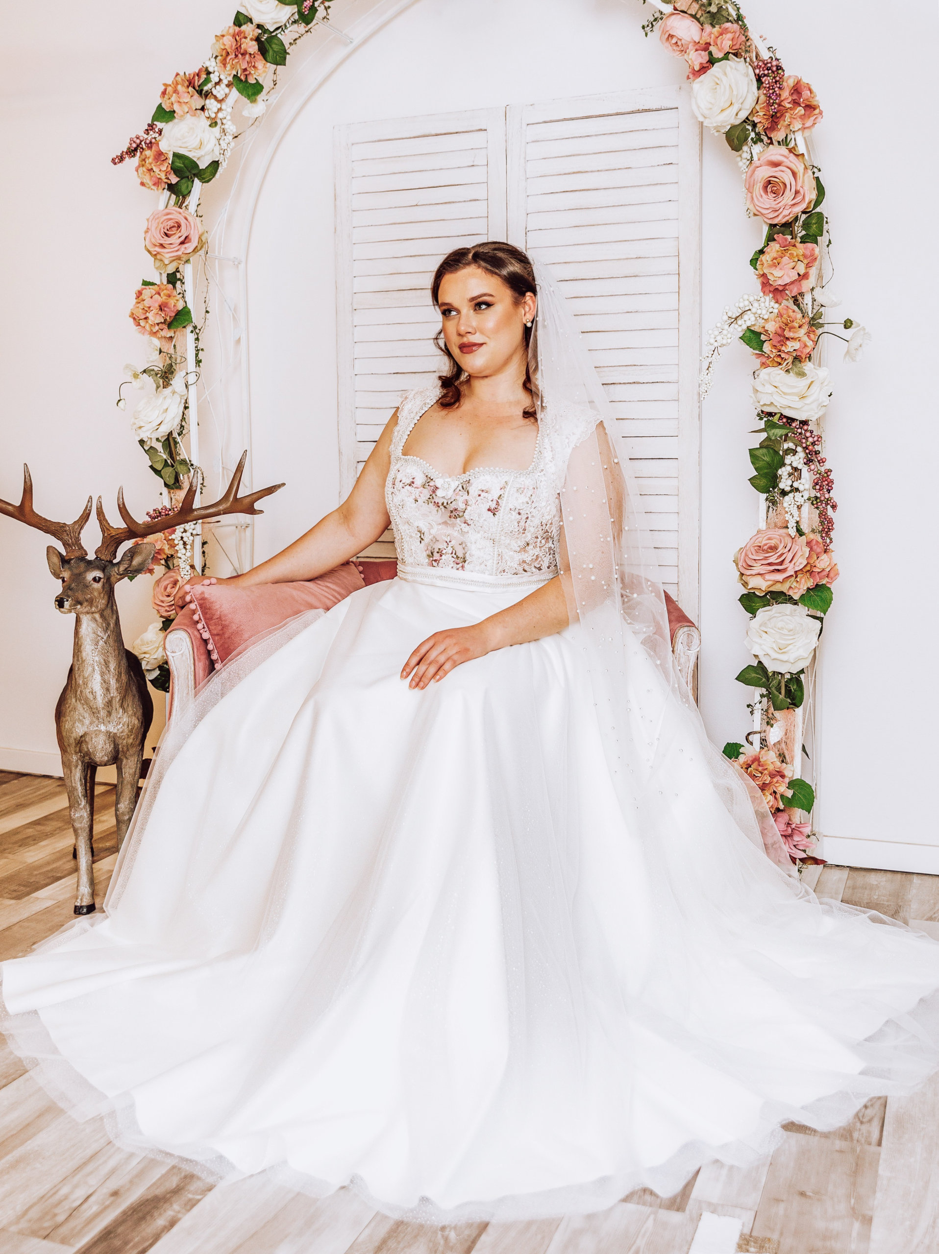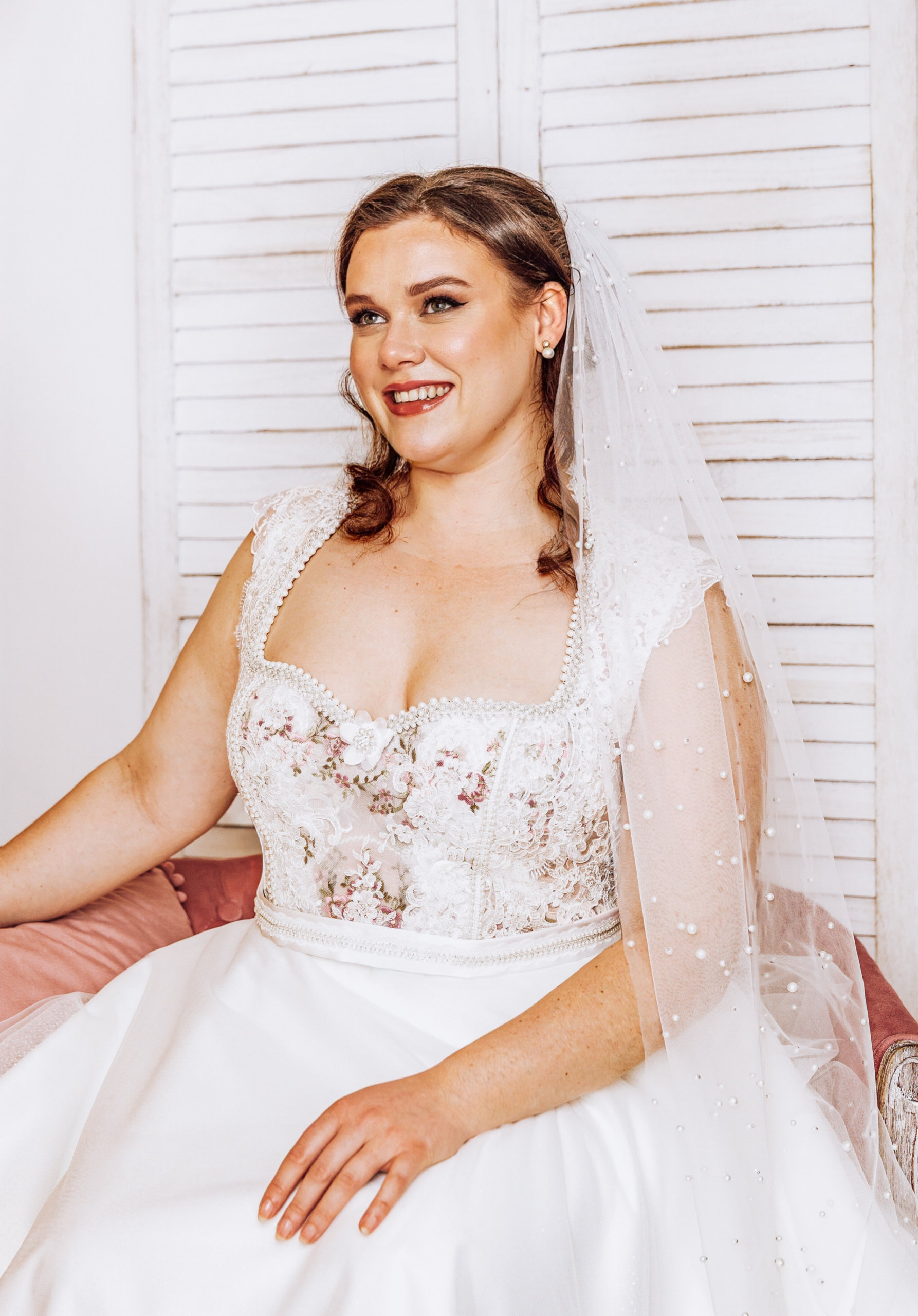 Wie jedes unserer Kleider ist dieses Modell auch mit anderen Rockformen, variablen Details & mit unserem Highlight dem Brautüberrock erhältlich.